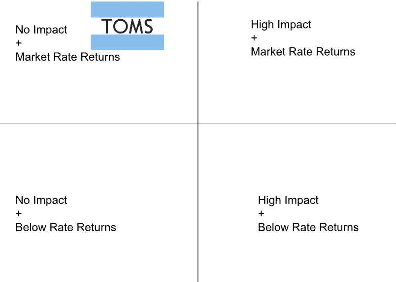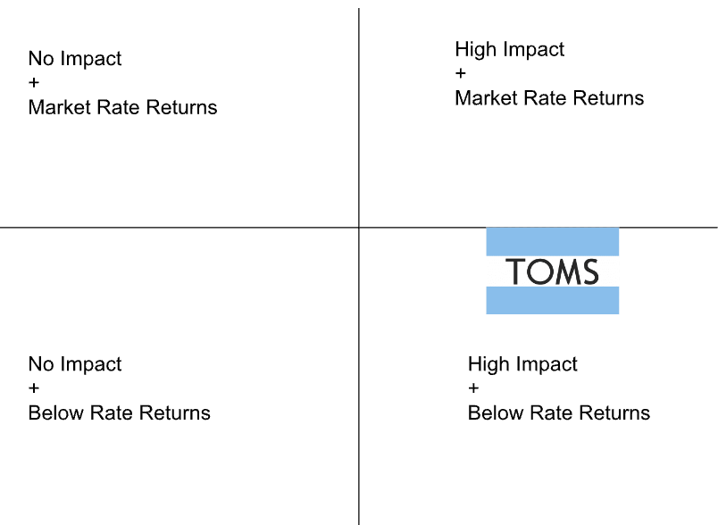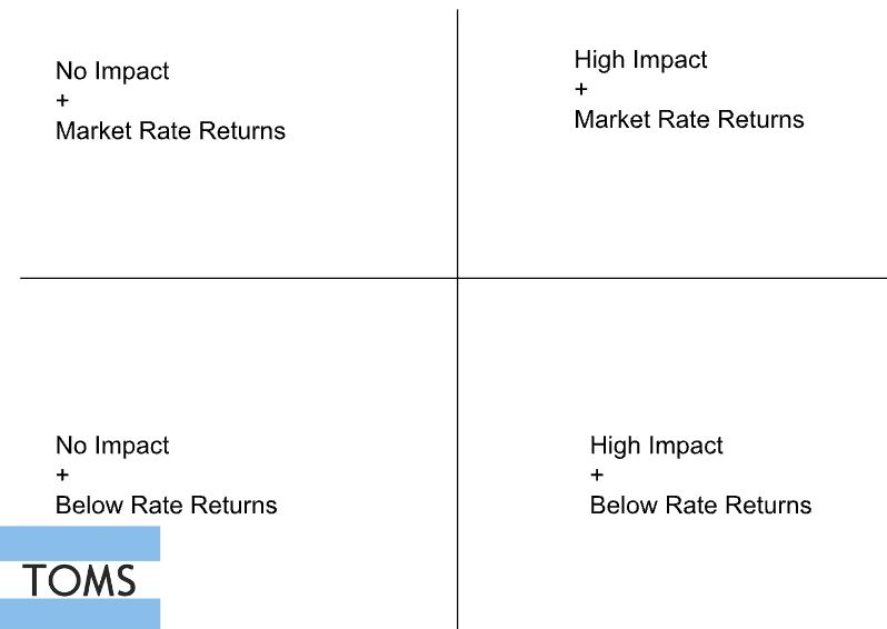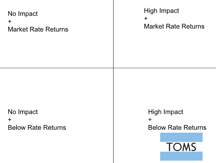 In reality, Toms did not need seed funding, as Mycoskie’s previous venture provided the $500k necessary to start sales. That doesn’t prevent it from being a glorious example of defying and return and impact relationship.