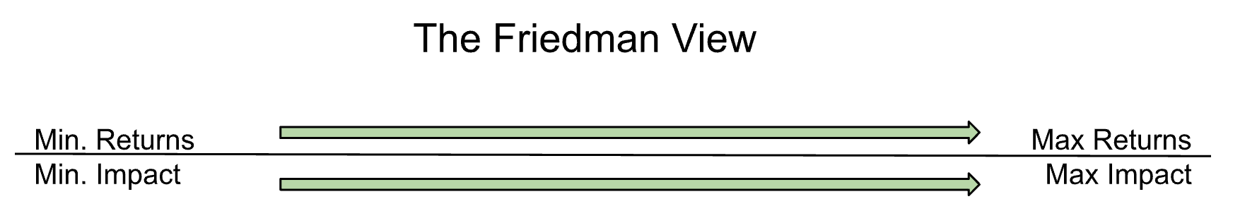 The Milton Friedman doctrine suggests the relationship between returns and impact fit on a spectrum where impact and returns are maximized at the same end.
