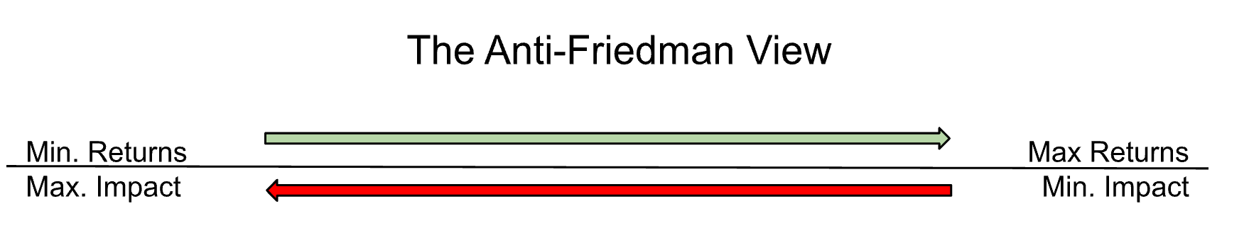 This leaves the Friedman and Anti-Friedman views as both delusionally absolutist. One is a false equivalency and the other a false tradeoff. The real-world proves and disproves both views constantly. Impact and returns are sometimes positively correlated and sometimes negatively correlated. Therefore, they do not have an inherent causal relationship.