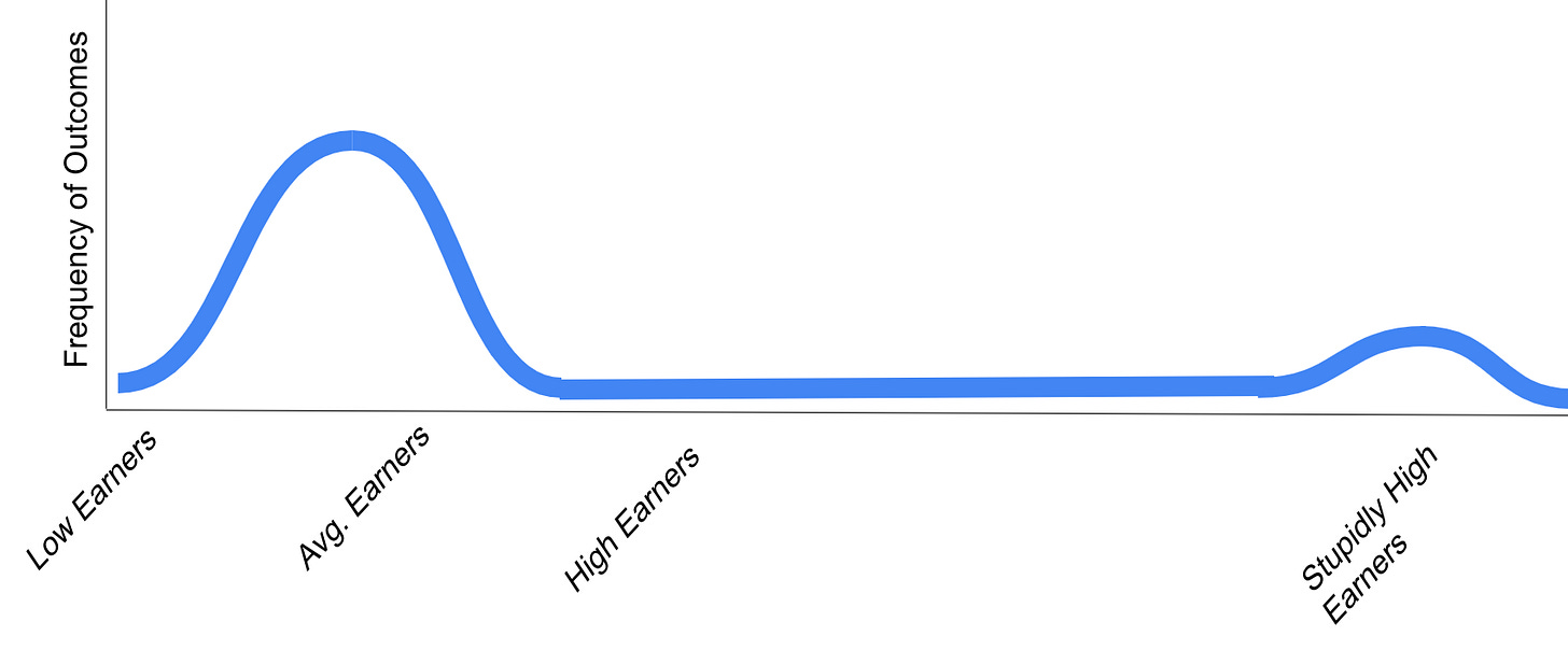 Meanwhile, “solopreneurs” expand what’s possible by a team of one every day. Previously, individuals incorporated businesses, which could then take on investment, generate revenue, and hire employees. Now, individuals can generate revenue well before incorporating. They incorporate businesses to hire employees and leverage revenue streams, if not only for legal trivialities. As a result, the point at which there is a wide dispersion of outcomes and the cost-of-capital will not reach consensus is day zero. Risk capital for individuals (perhaps even in another form altogether?) is an inevitability.